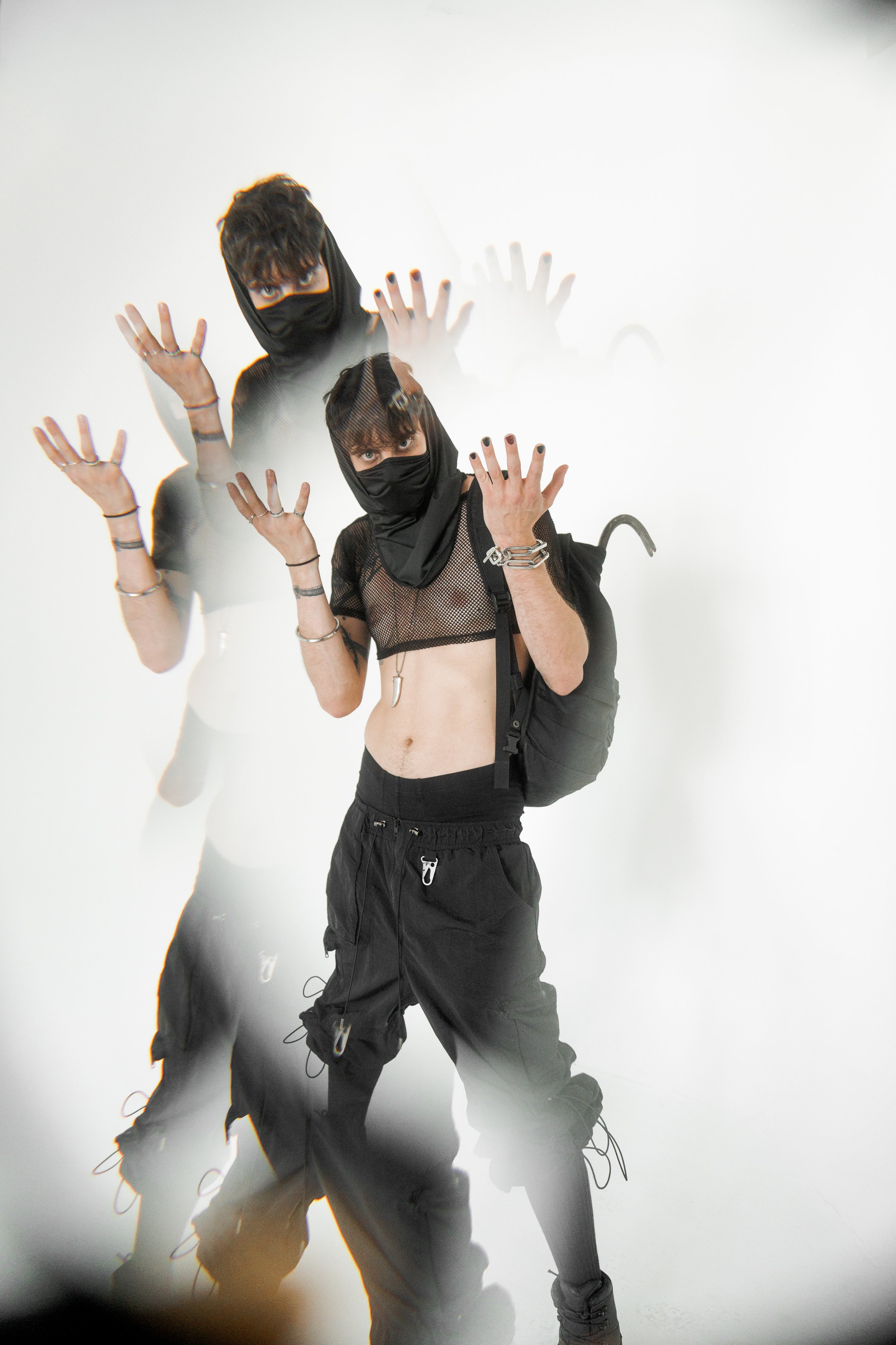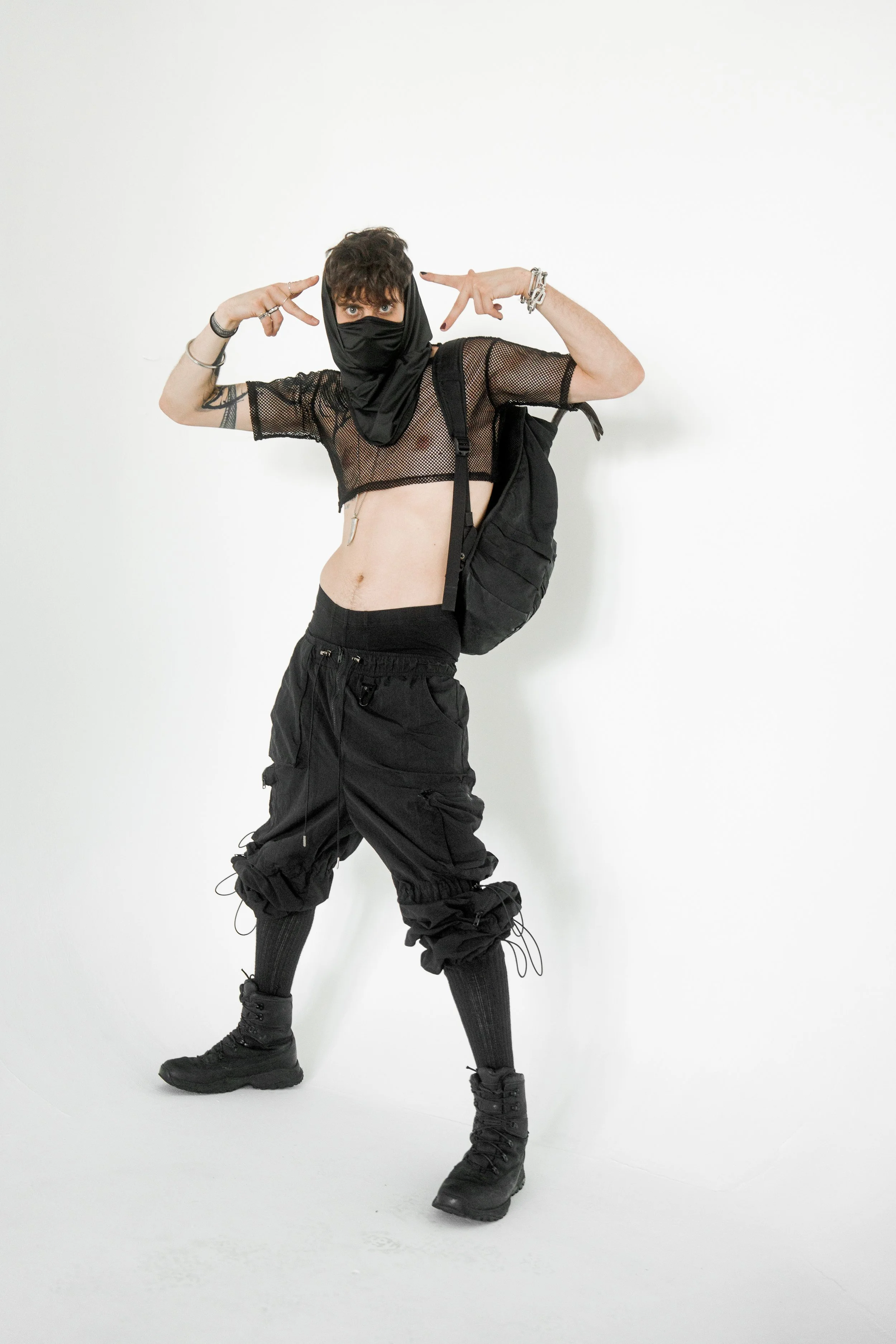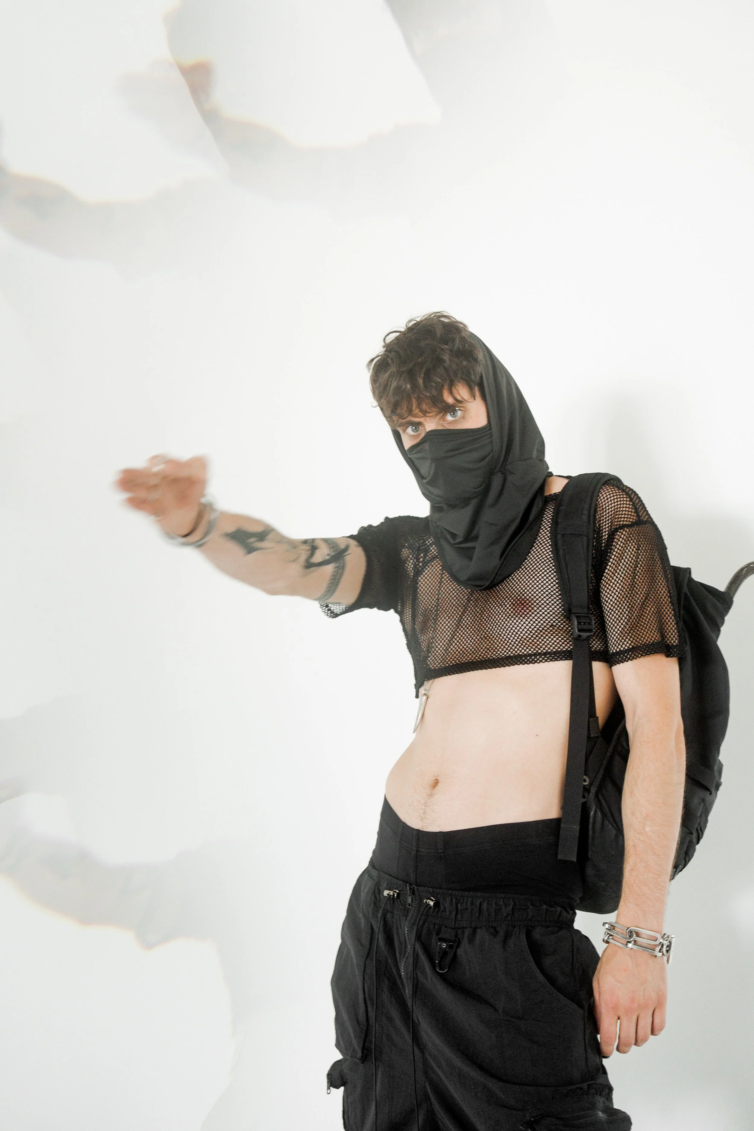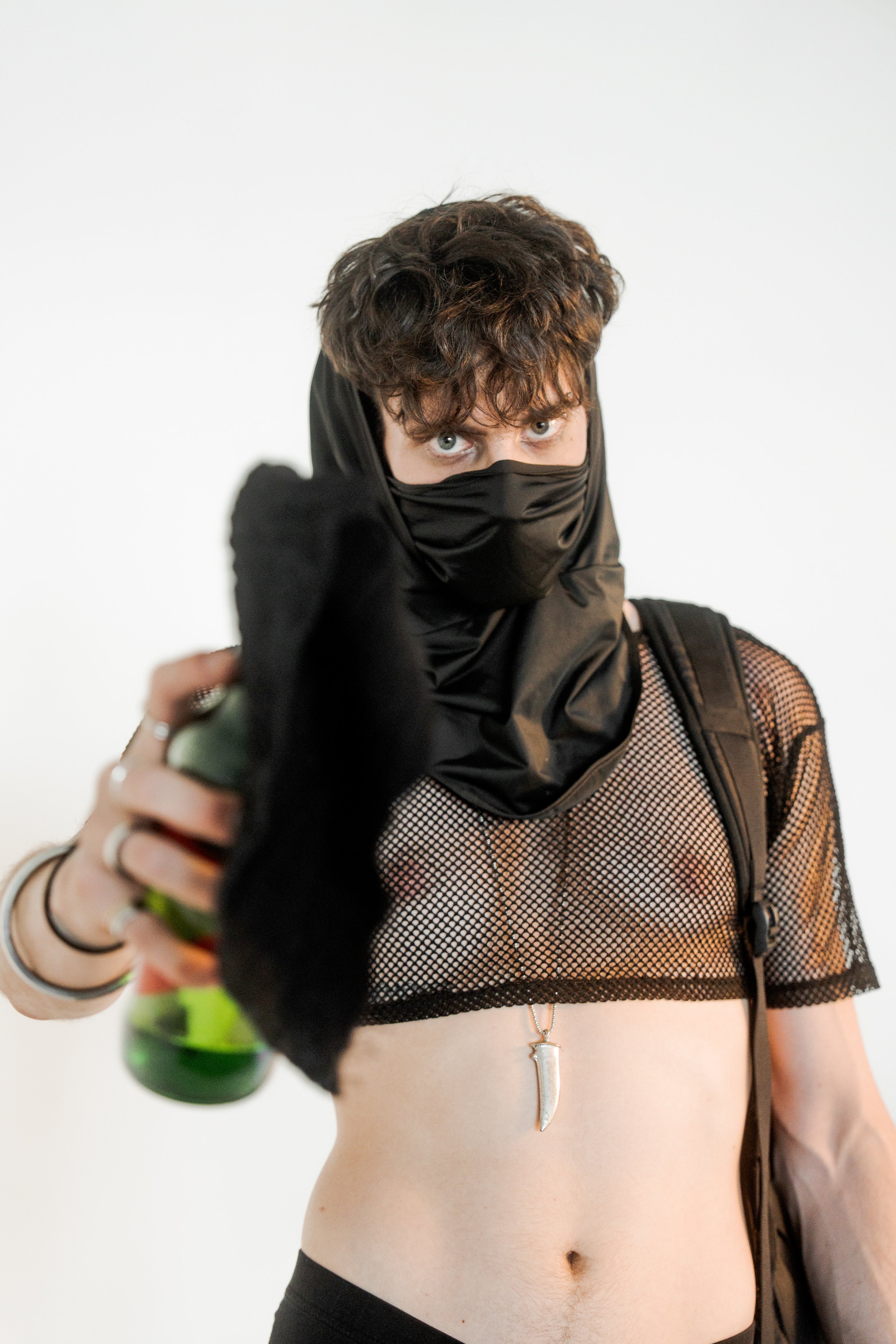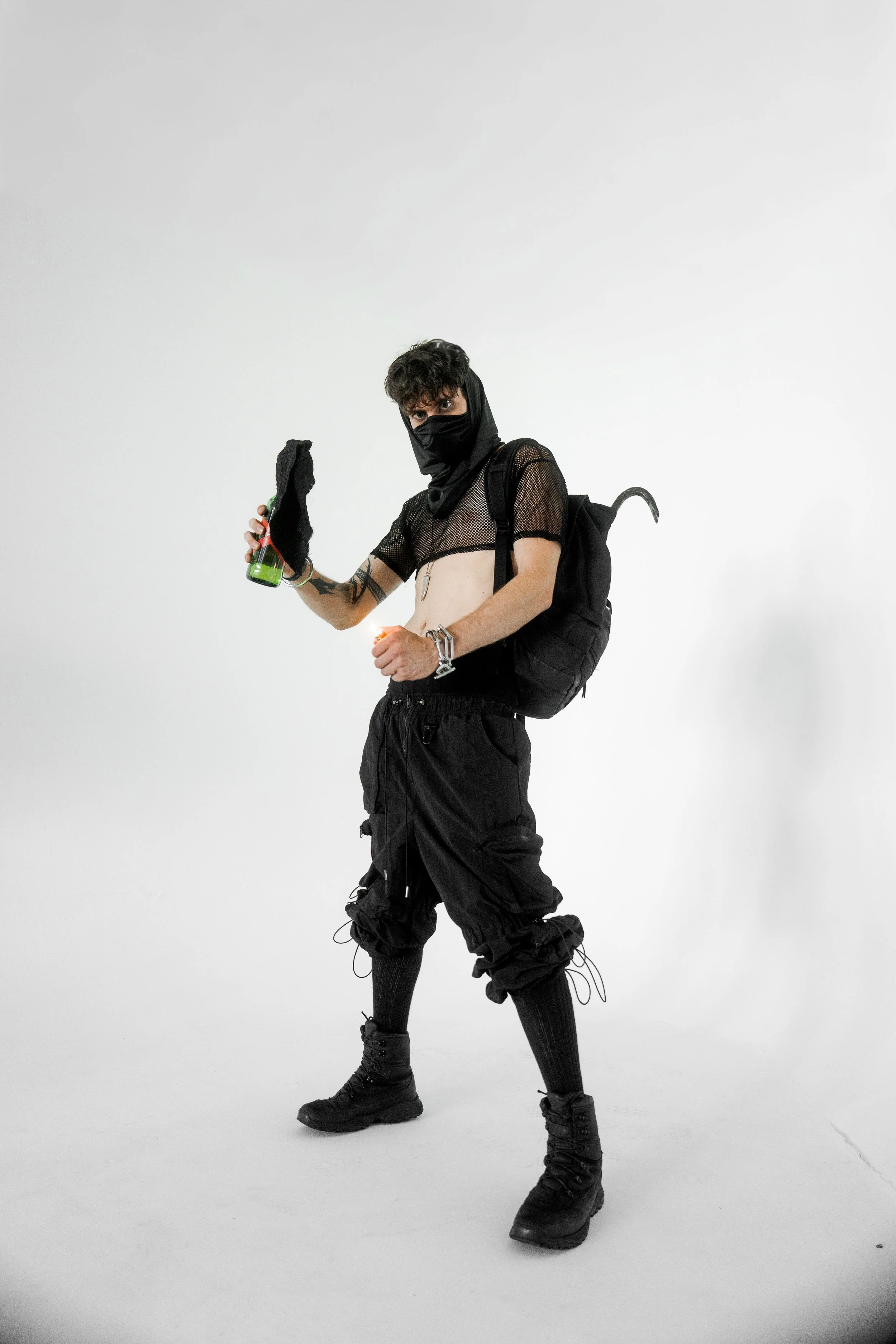 Masked, armored in black, the figure blurs the line between runway and rebellion. The Molotov becomes a symbol of disruption, style sharpened into defiance.