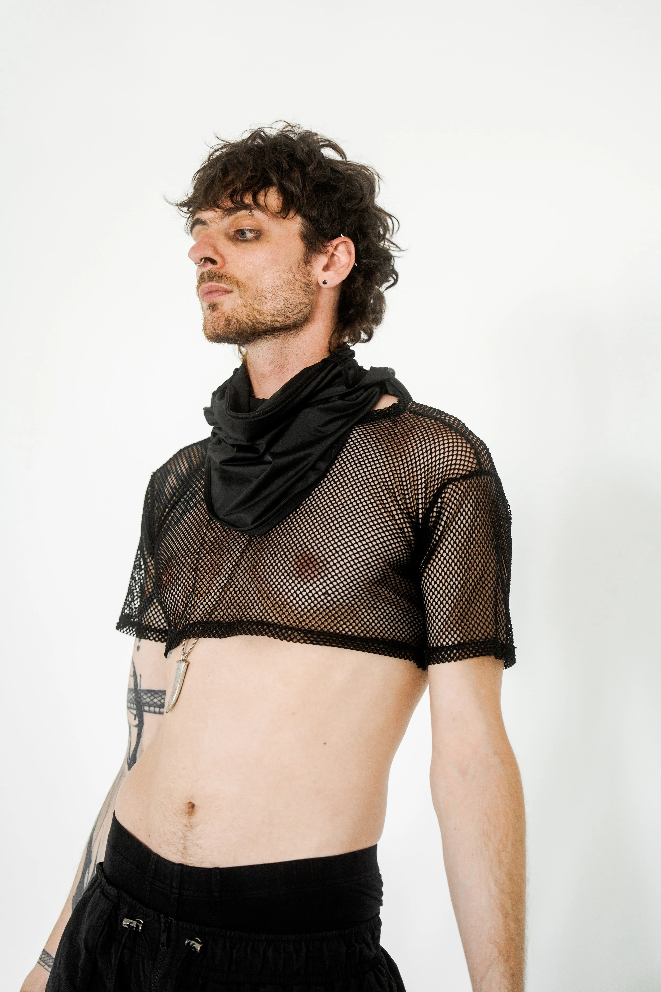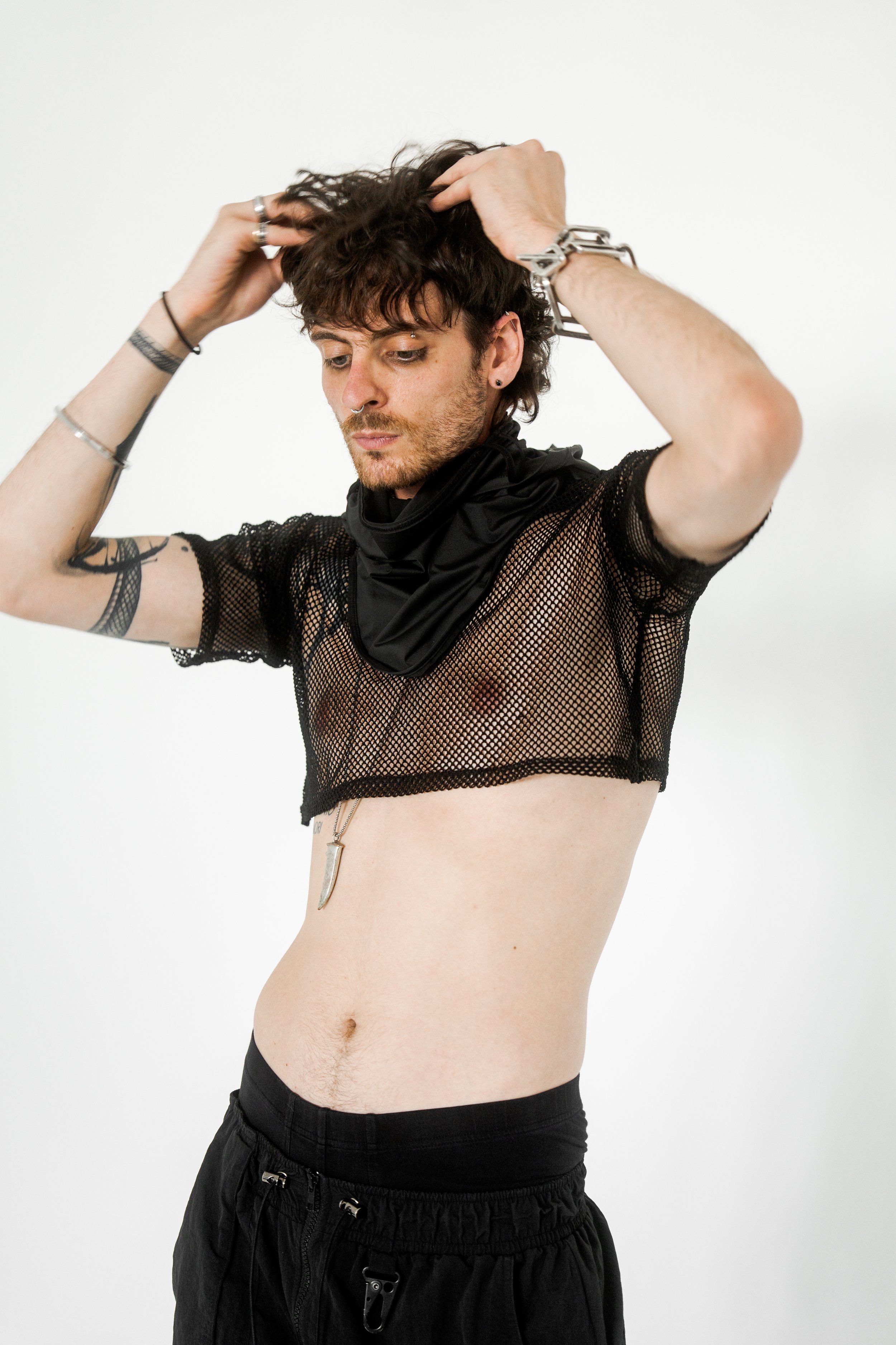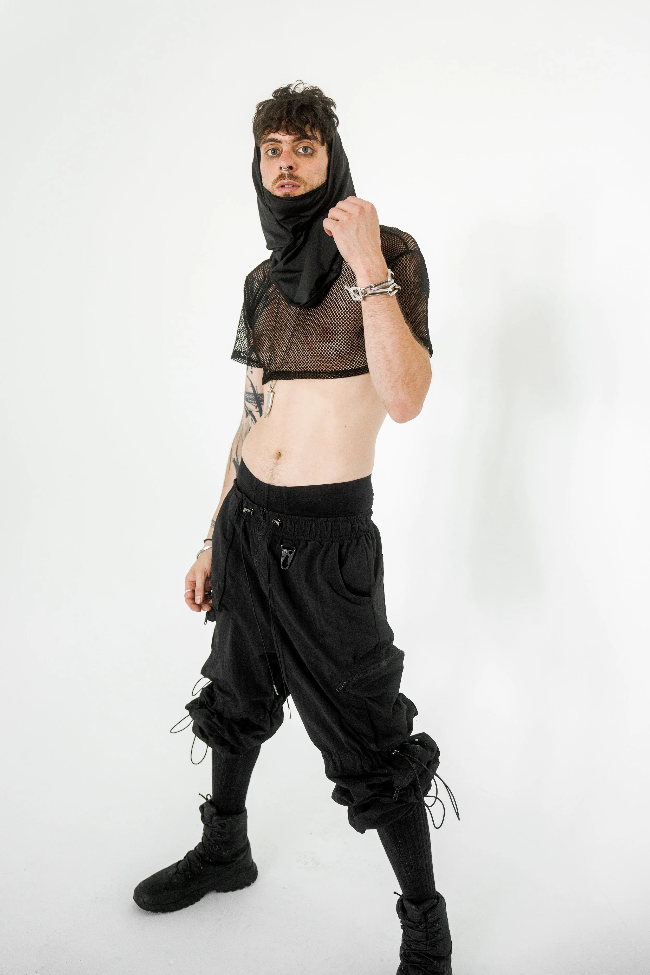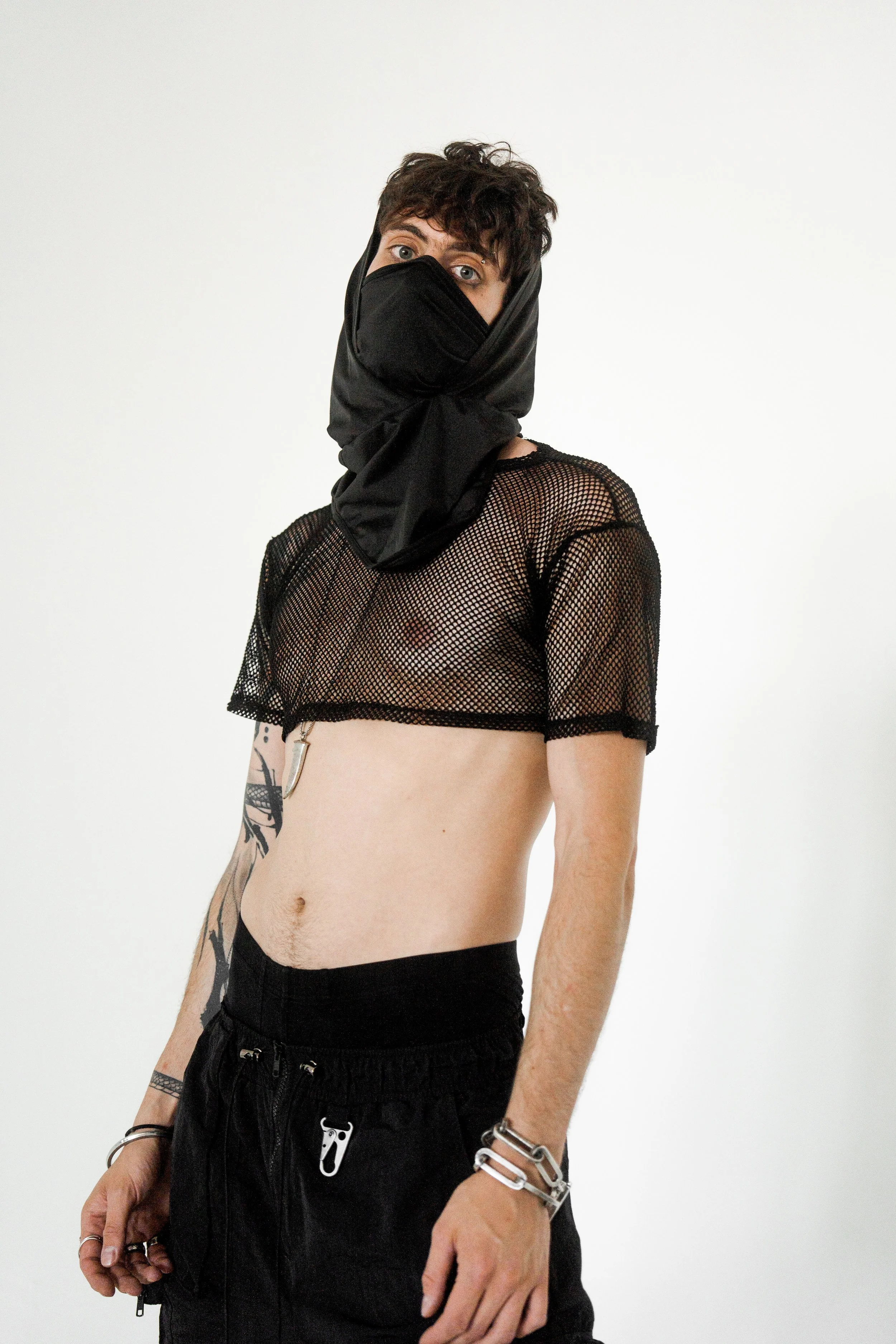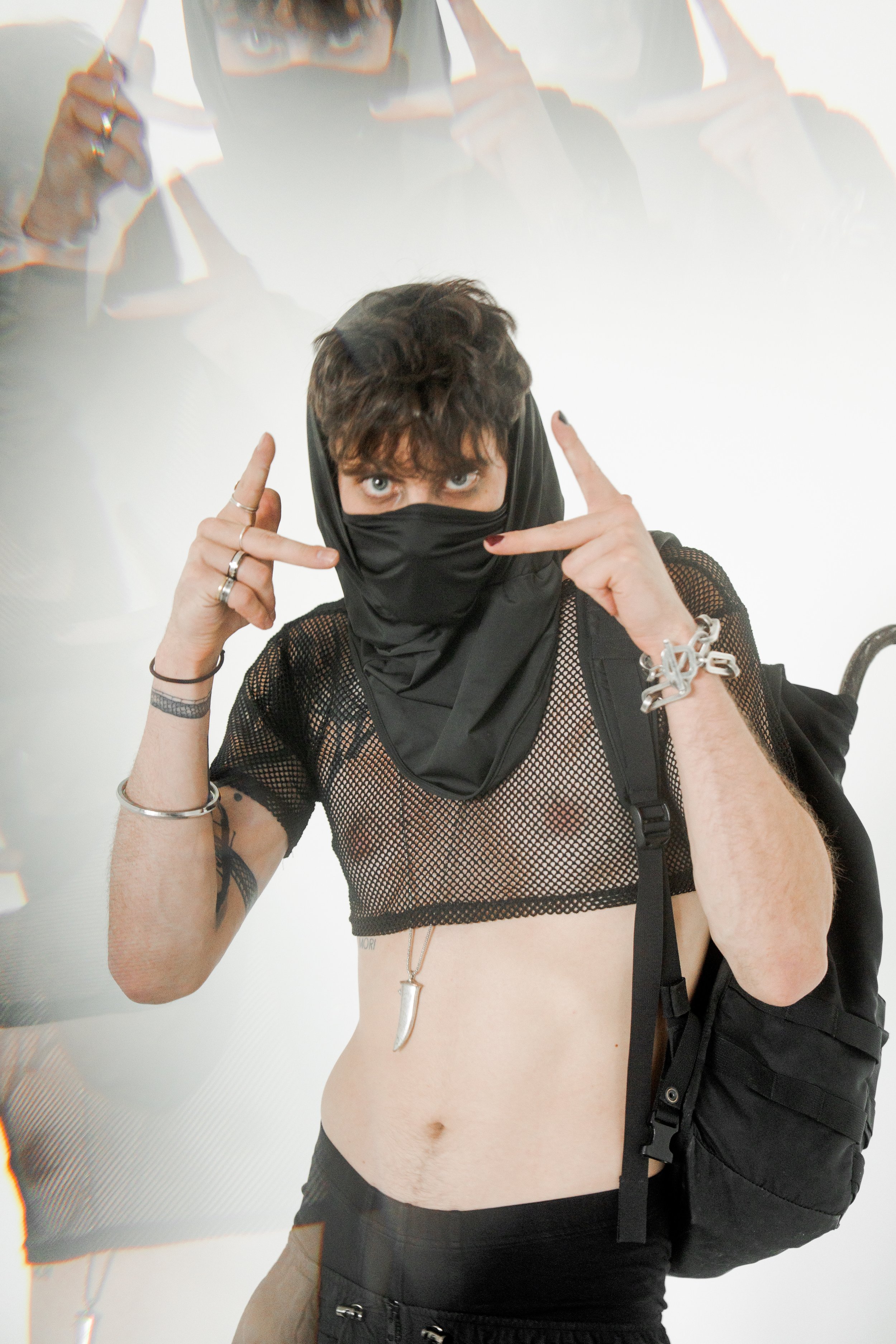 Masked, armored in black, the figure blurs the line between runway and rebellion. The Molotov becomes a symbol of disruption, style sharpened into defiance.