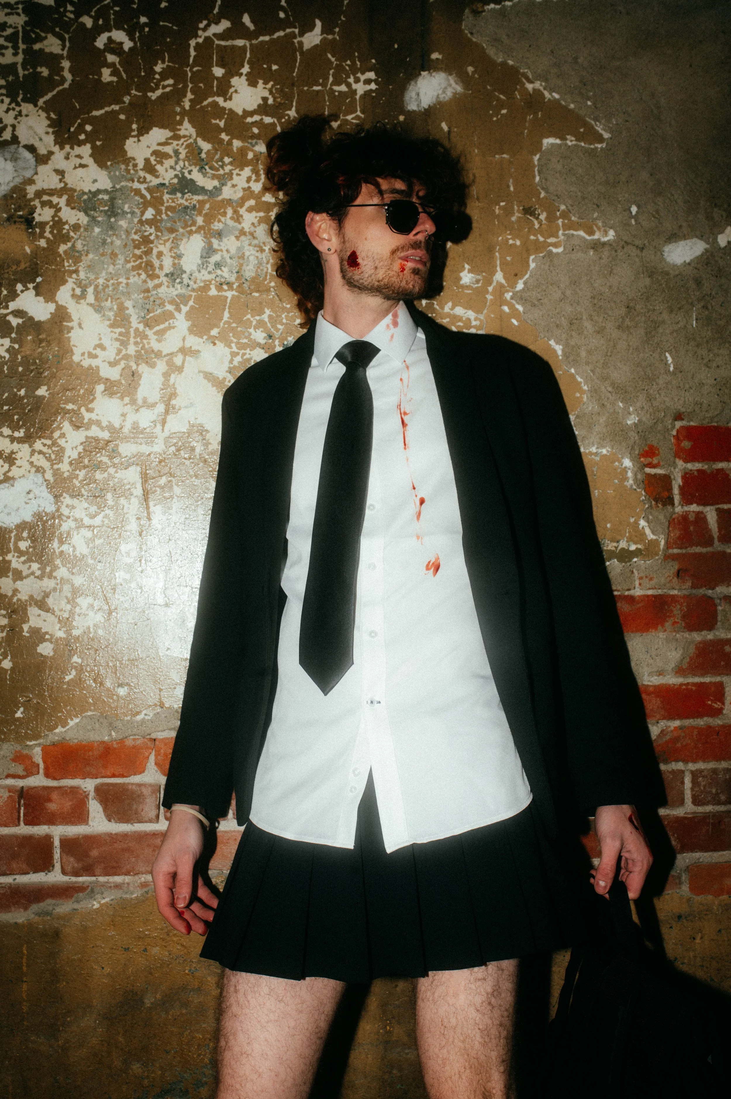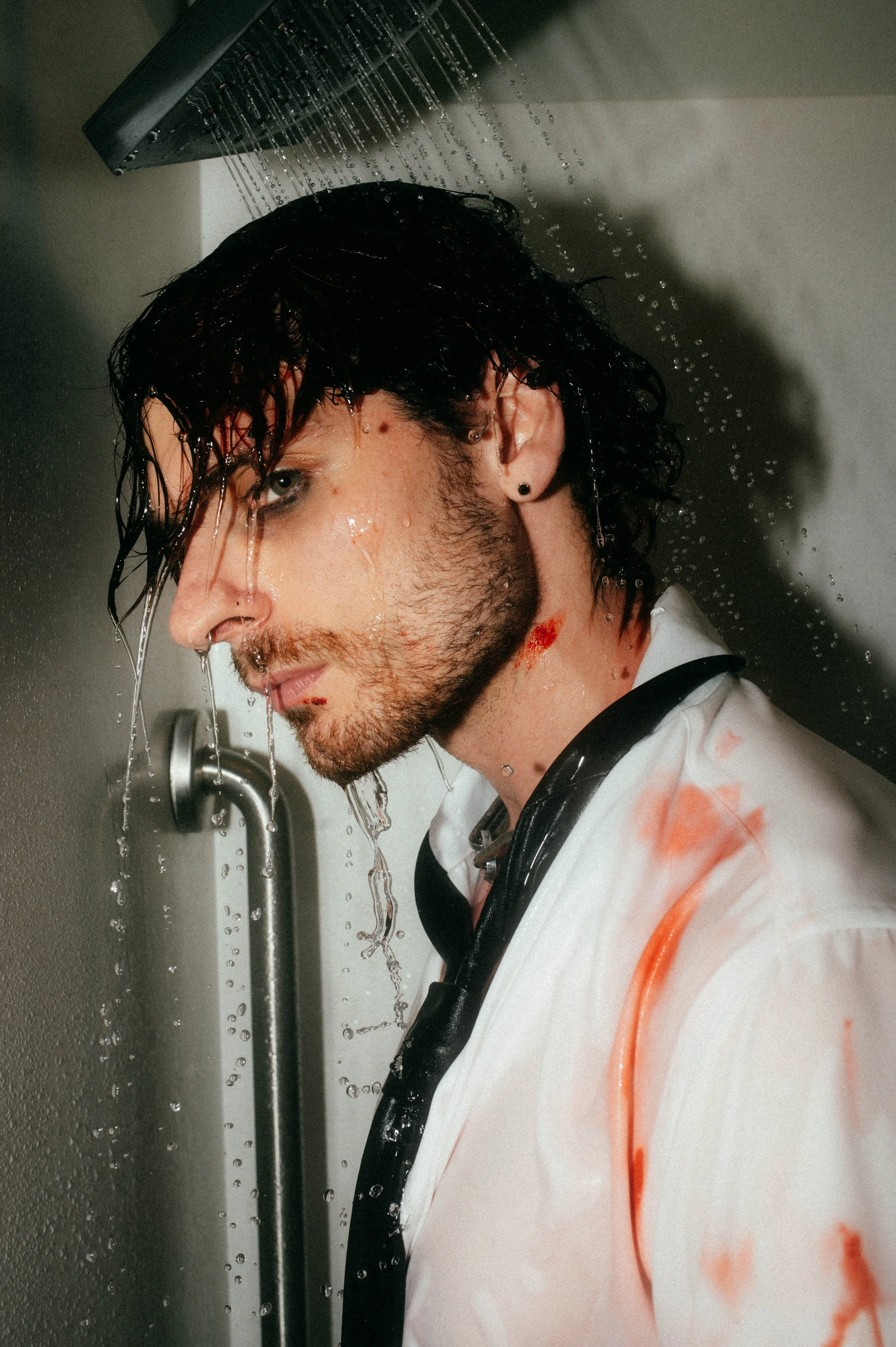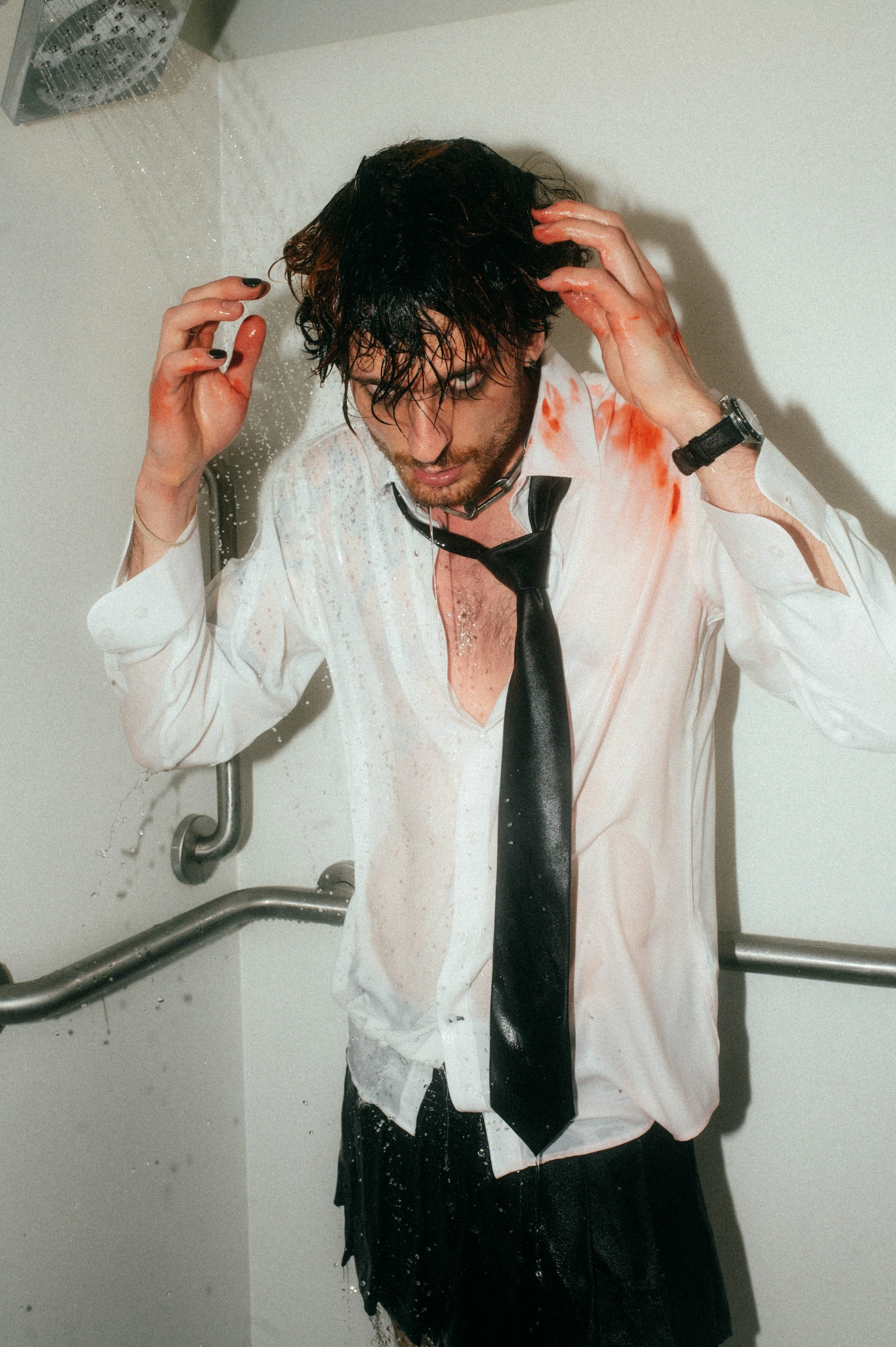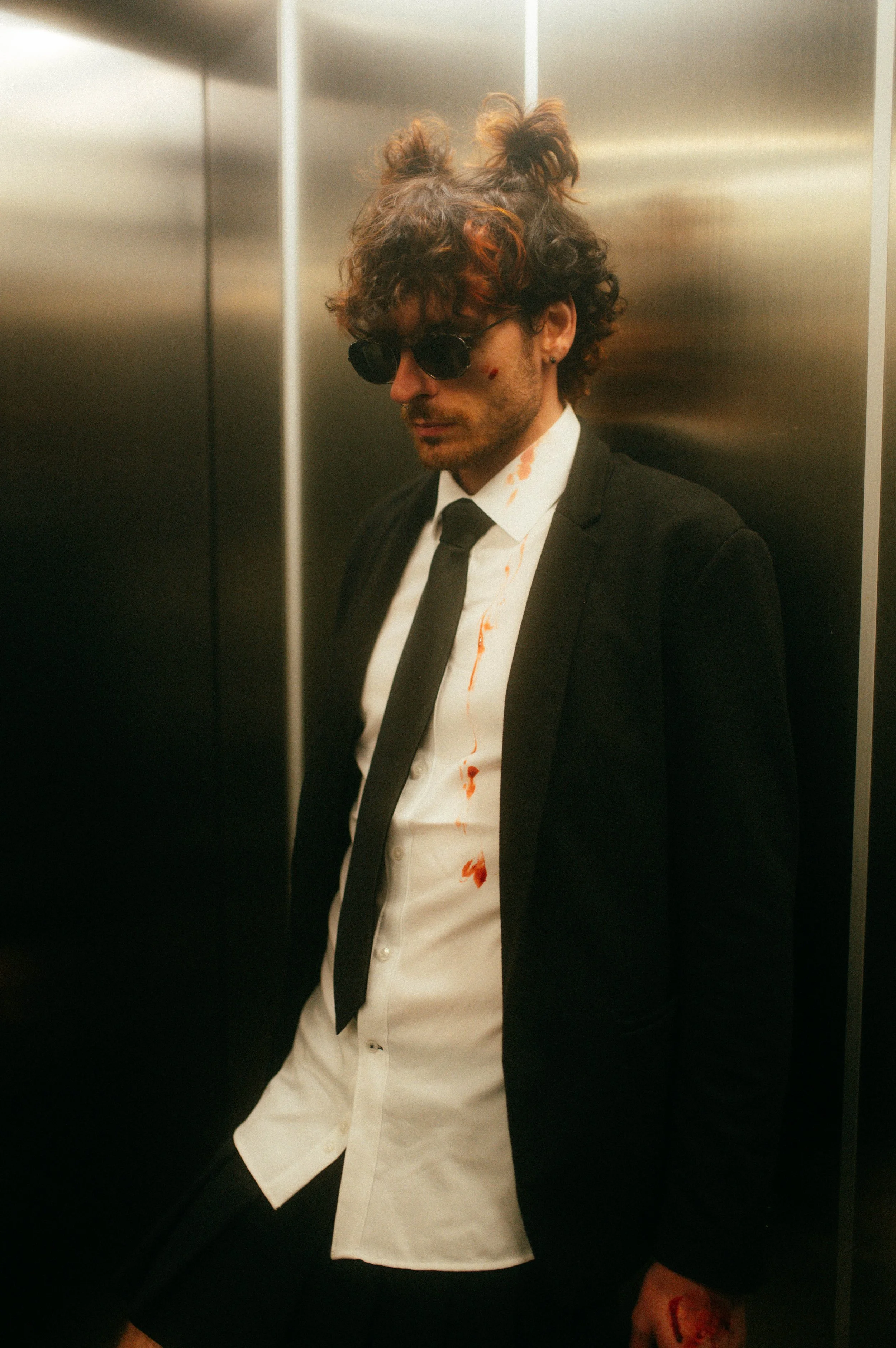 The tuxedo becomes a wound, the blood a symbol of what labor extracts from the soul. Stress lingers in smoke, in glass, in reflection. Creation is both escape and obsession. Cleansing becomes survival. A ritual to endure, dressed in androgyny, poised between collapse and control.