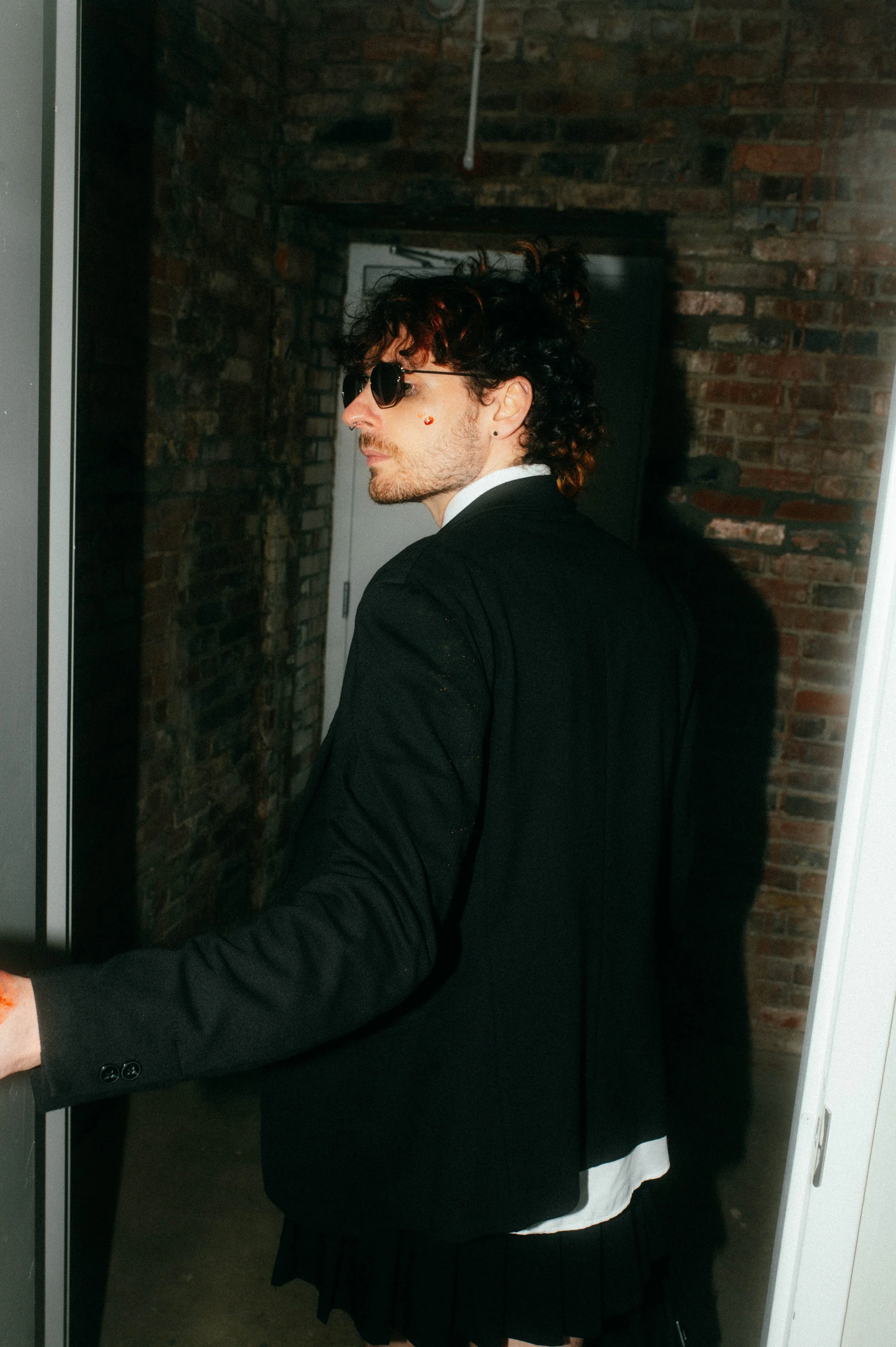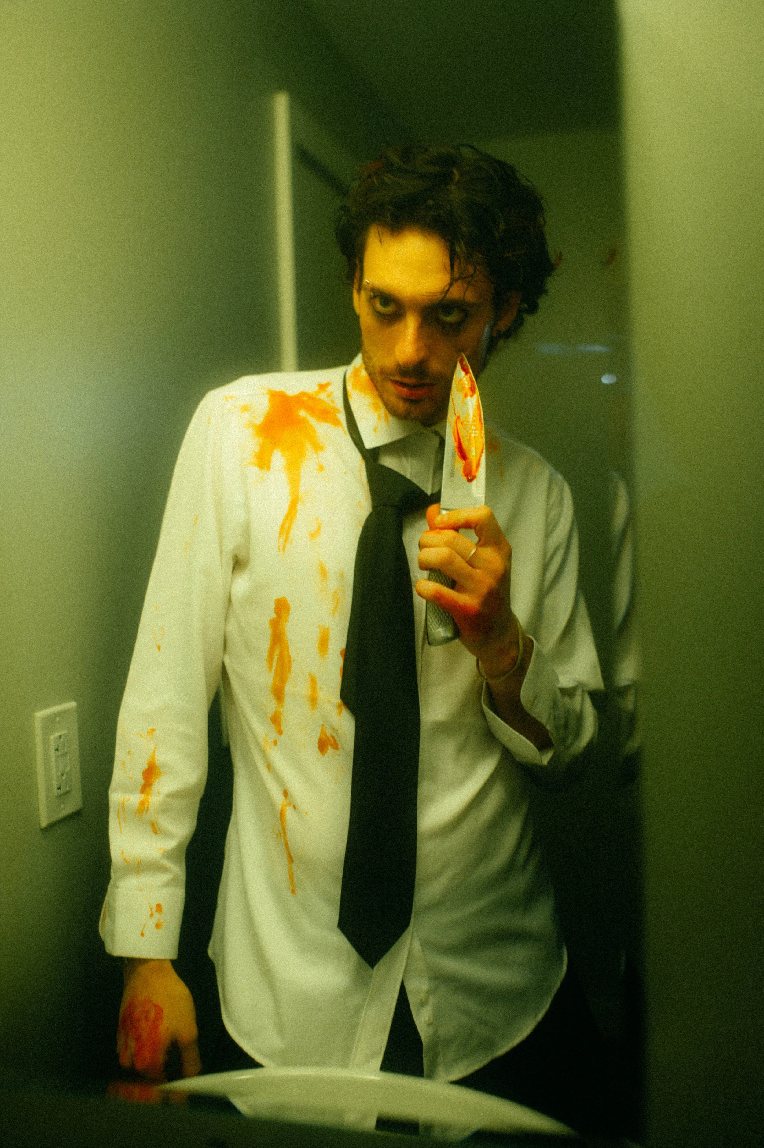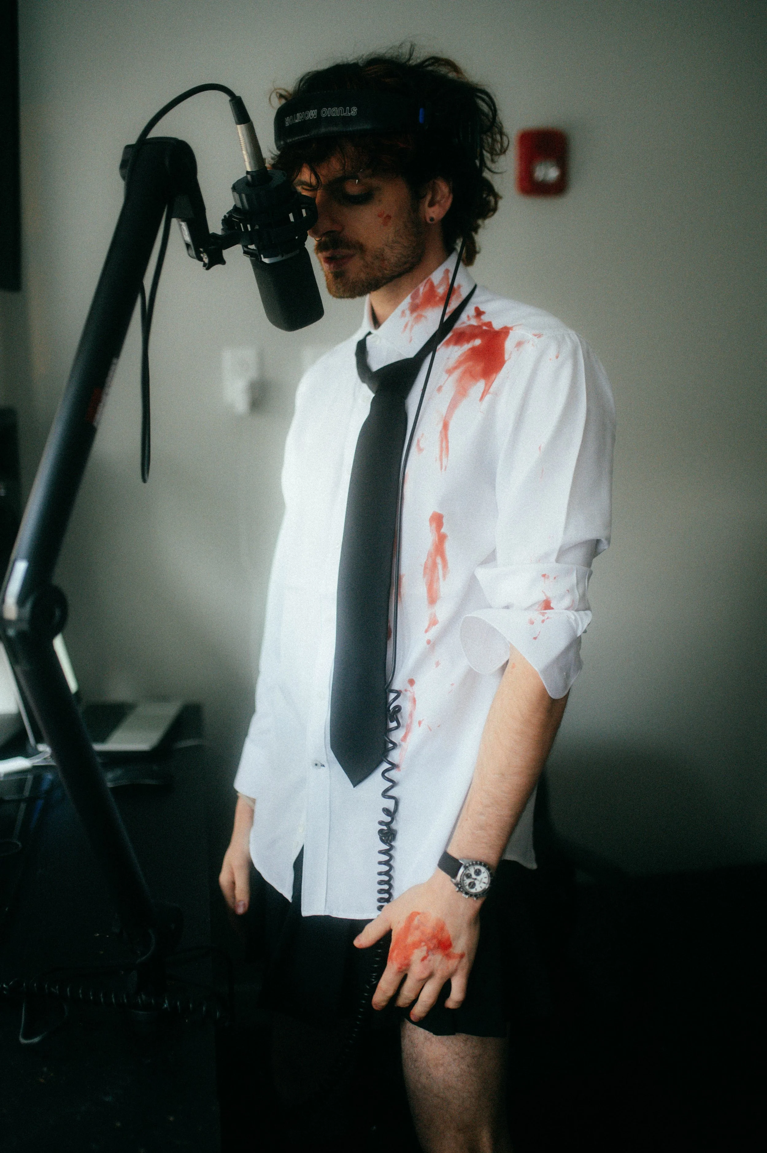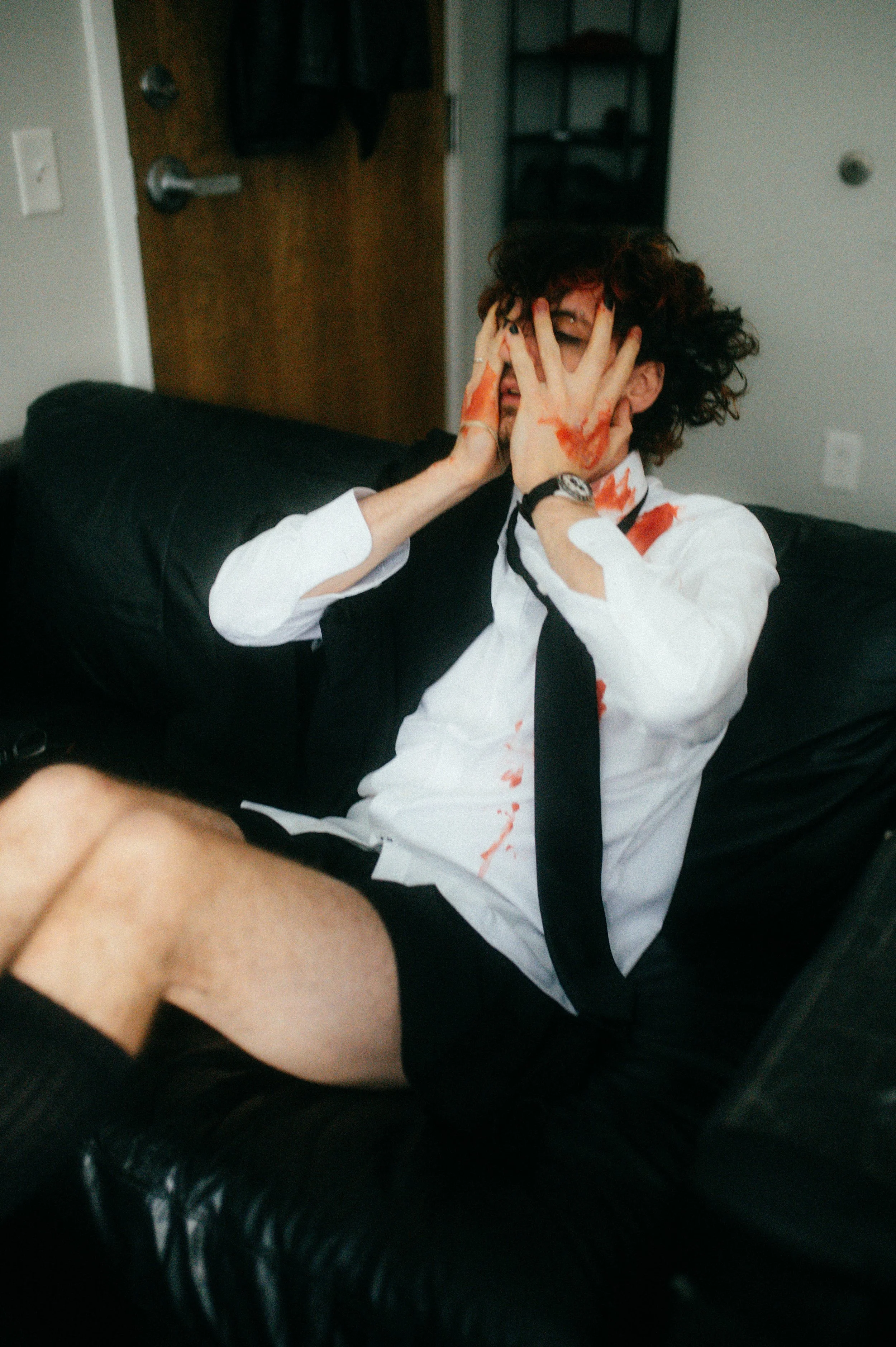 The tuxedo becomes a wound, the blood a symbol of what labor extracts from the soul. Stress lingers in smoke, in glass, in reflection. Creation is both escape and obsession. Cleansing becomes survival. A ritual to endure, dressed in androgyny, poised between collapse and control.