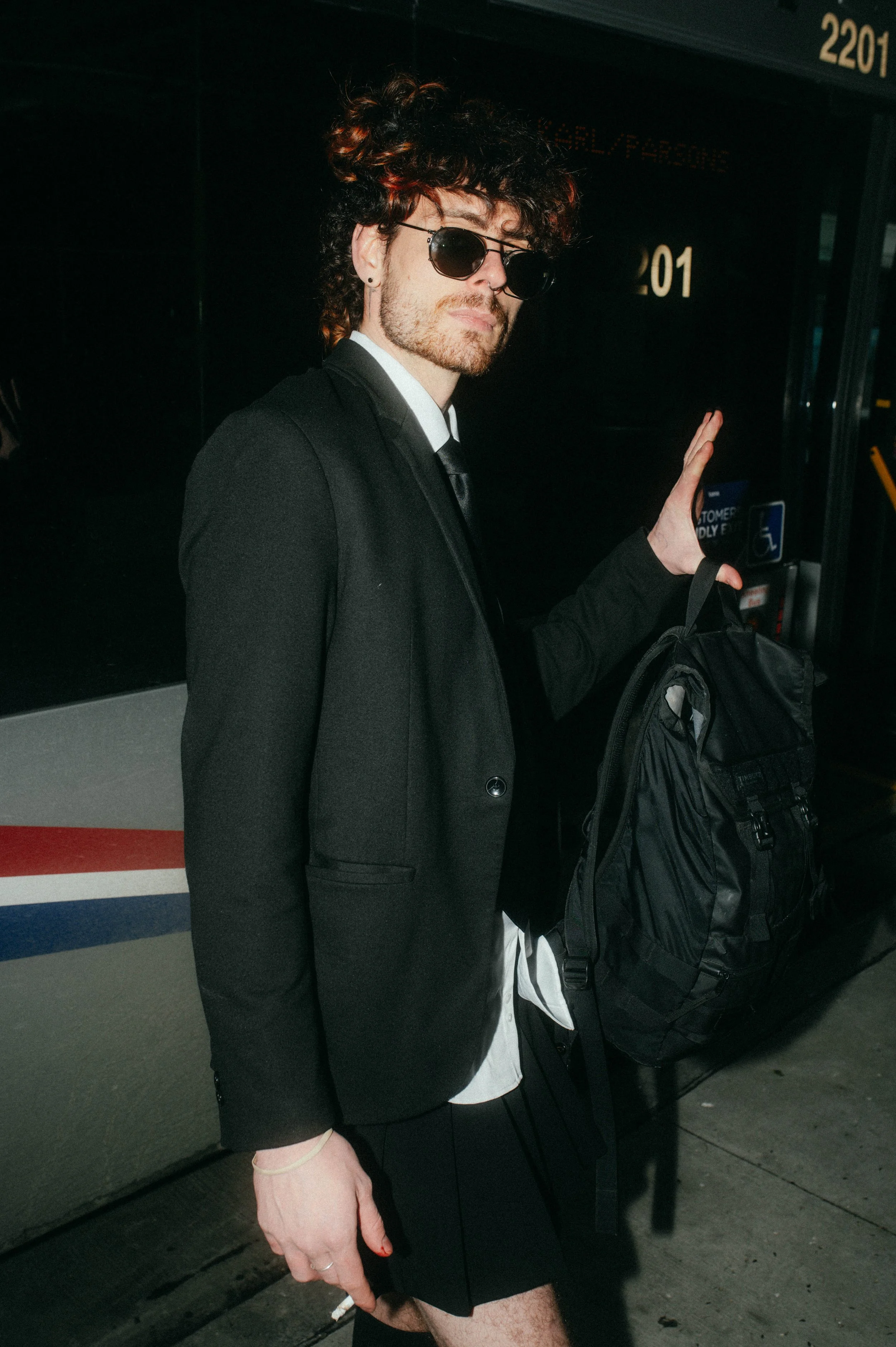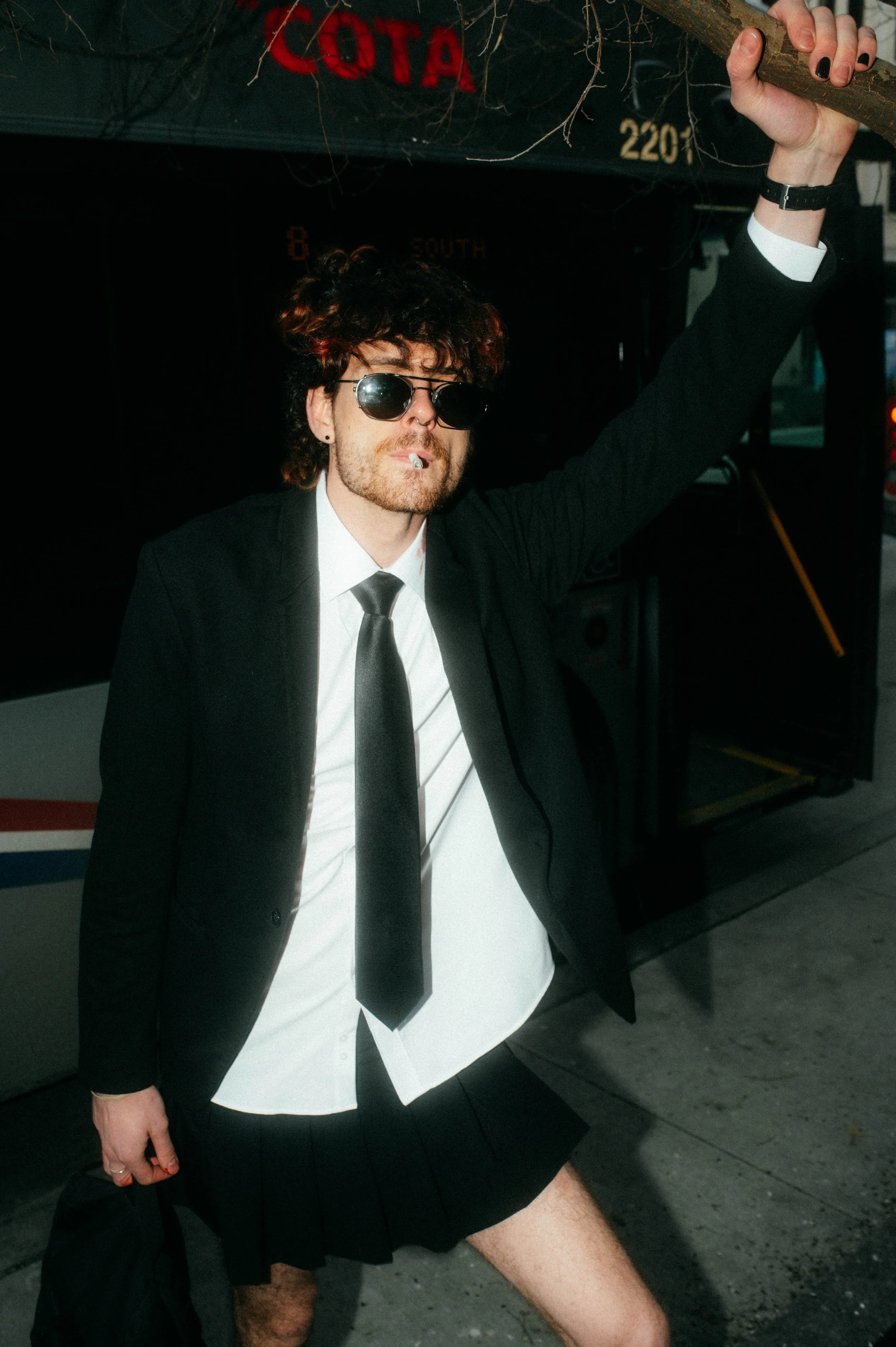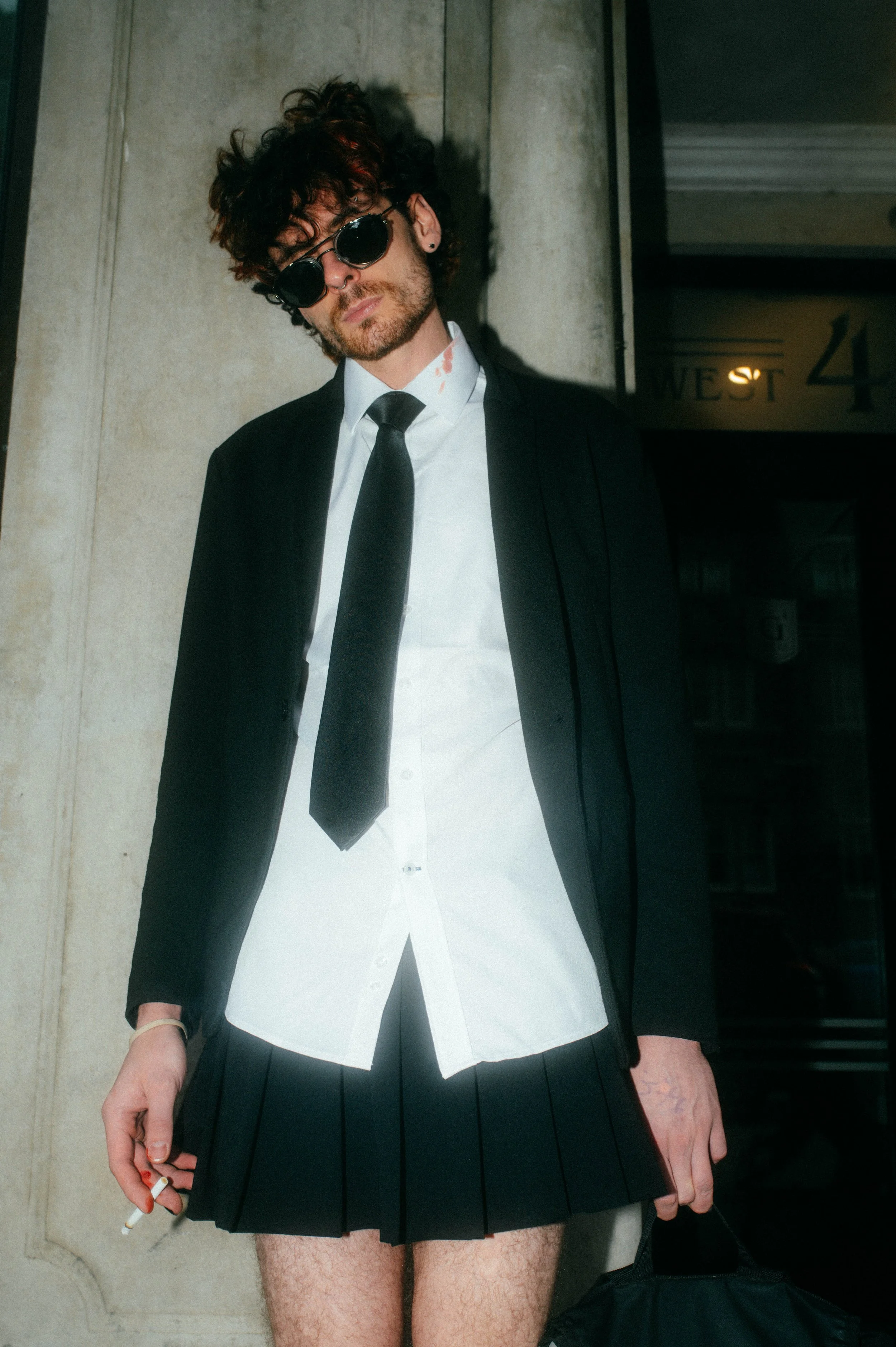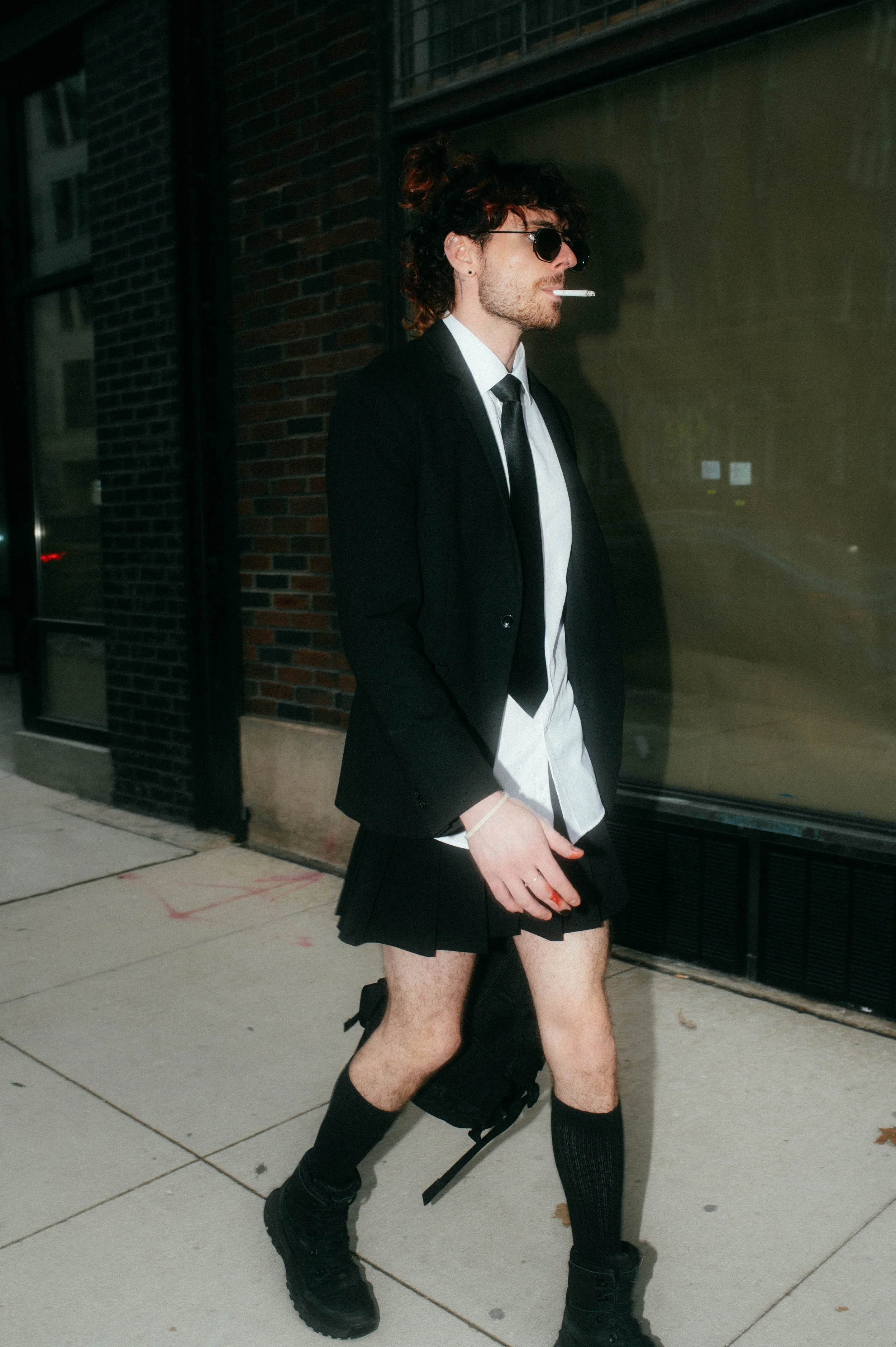 The tuxedo becomes a wound, the blood a symbol of what labor extracts from the soul. Stress lingers in smoke, in glass, in reflection. Creation is both escape and obsession. Cleansing becomes survival. A ritual to endure, dressed in androgyny, poised between collapse and control.